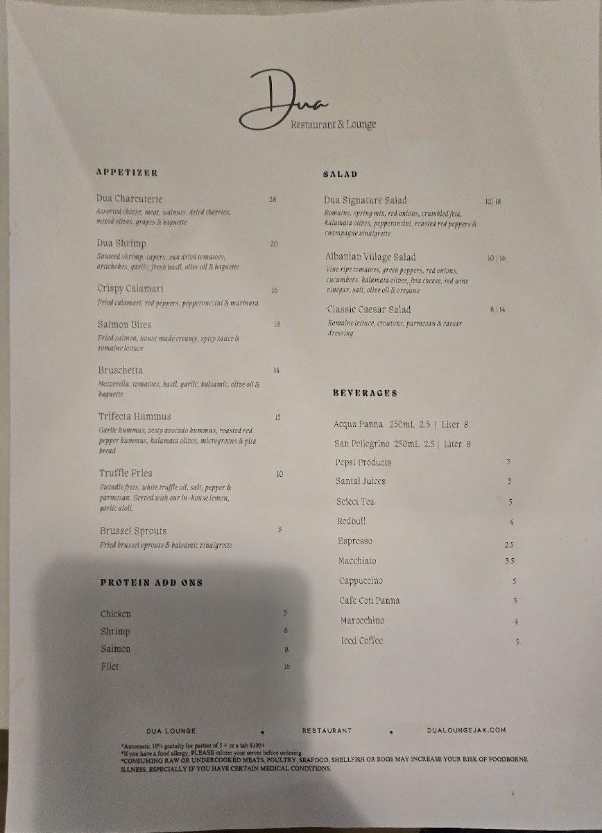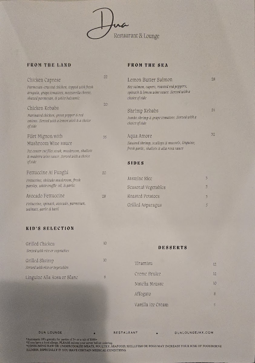 Welcome to Dua Restaurant & Lounge, where culinary delights meet a vibrant atmosphere in Jacksonville, FL. Nestled at 8532 Baymeadows Rd, this dining gem tantalizes with a menu that features an array of flavor-packed dishes, ensuring every plate tells a story. From the charcuterie board and fettuccine ai fungi to the succulent shrimp kabobs, each item is crafted with precision, celebrating both taste and presentation.